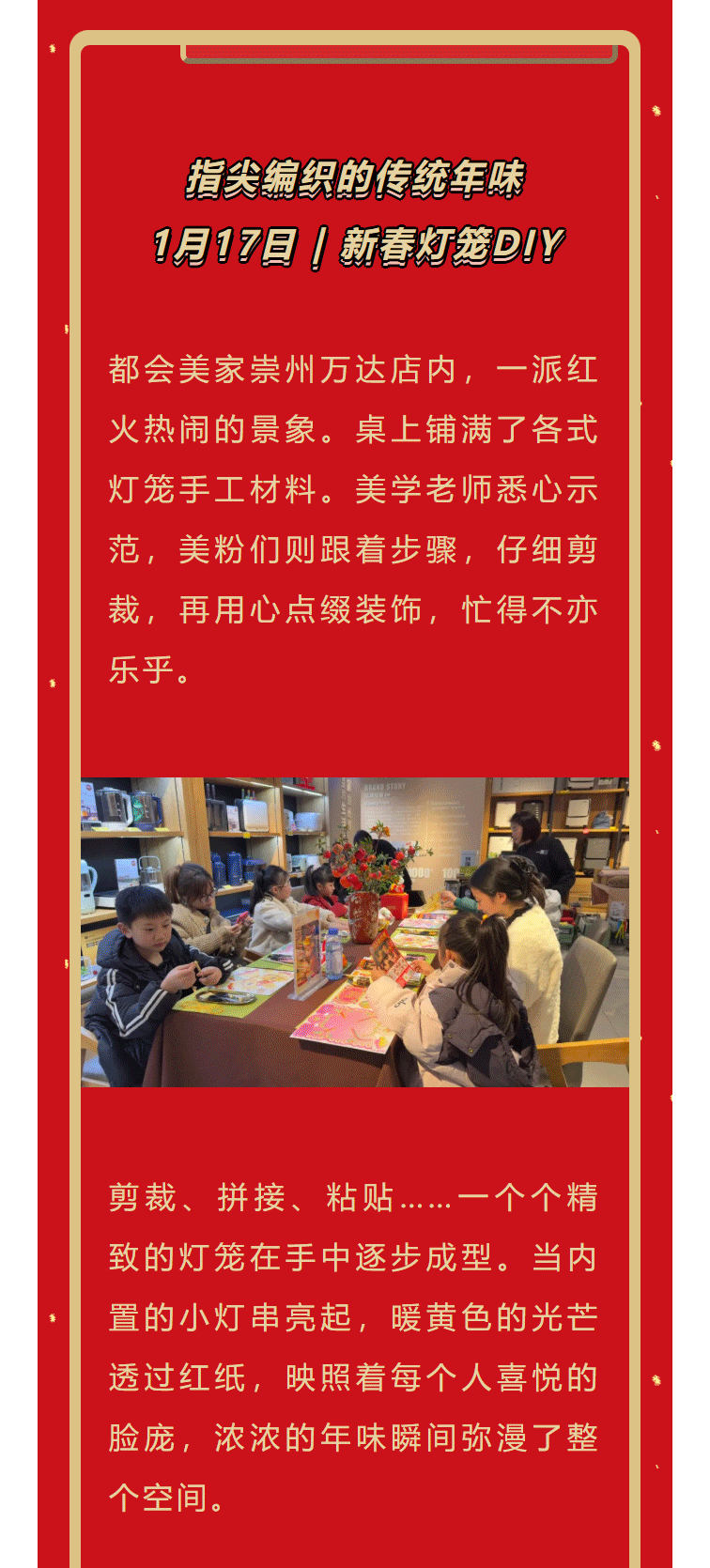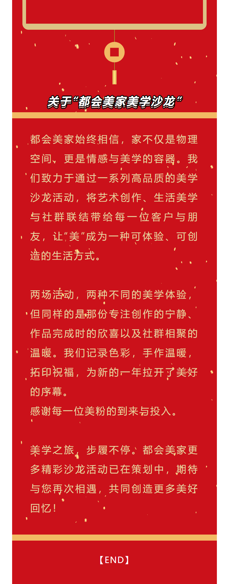 最新发布 美学沙龙暖冬雅集,在手作时光里邂逅新年之美 2026-01-23 经纬织新岁 锦画贺华年 | 方旭公益 x 泽南世家——非遗织锦画DIY沙龙 2026-01-23 方旭公益 x 都会美家新年非遗织锦画DIY沙龙 2026-01-23 织锦台灯DIY:在经纬交织中,寻回生活的雅趣与温度——泽南世家美学沙龙活动 2026-01-23 古风水晶手串DIY一场穿越千年的诗意邂逅——都会美家重庆SKLP店美学沙龙 2026-01-23 蝶古巴特艺术台灯DIY——都会美家重庆大悦城店美学沙龙 2026-01-23 “瓷上生花·创意美好 2026-01-23 成华区人大常委会领导走访泽南家居开展 2026-01-23 都会美家:让生活美学在都市中自由生长 2026-01-23 巾帼心向党 铿锵绽芳华—泽南党支部“三八”节活动 2026-01-23